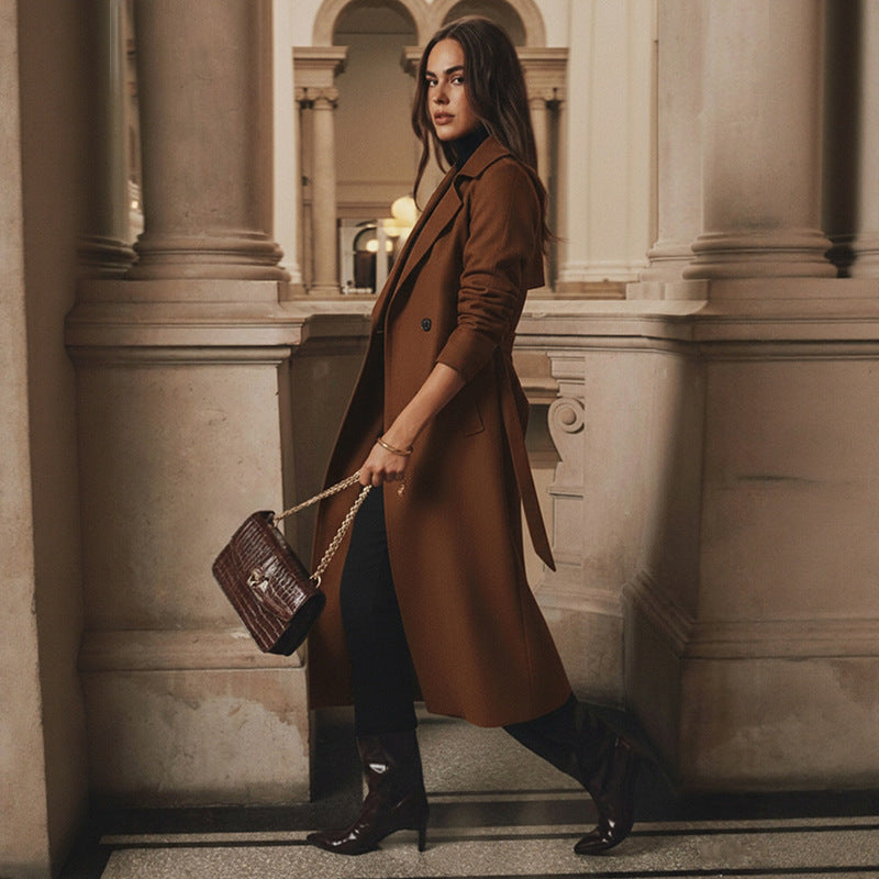 Jego dwurzędowy fason z szerokimi klapami i paskiem w talii nadaje sylwetce proporcji, a ciepły odcień brązu wprowadza do garderoby subtelną elegancję. To model, który świetnie wygląda zarówno w codziennym miejskim rytmie, jak i podczas wyjątkowych okazji.